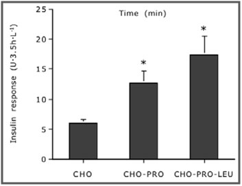 Research demonstrates that the addition of whey protein to a carbohydrate (CHO) drink, post-workout, accelerated muscle glycogen synthesis compared to CHO alone.  The result may be attributed to a greater insulin response to the CHO/PRO combination than with CHO alone (see Figure 1).